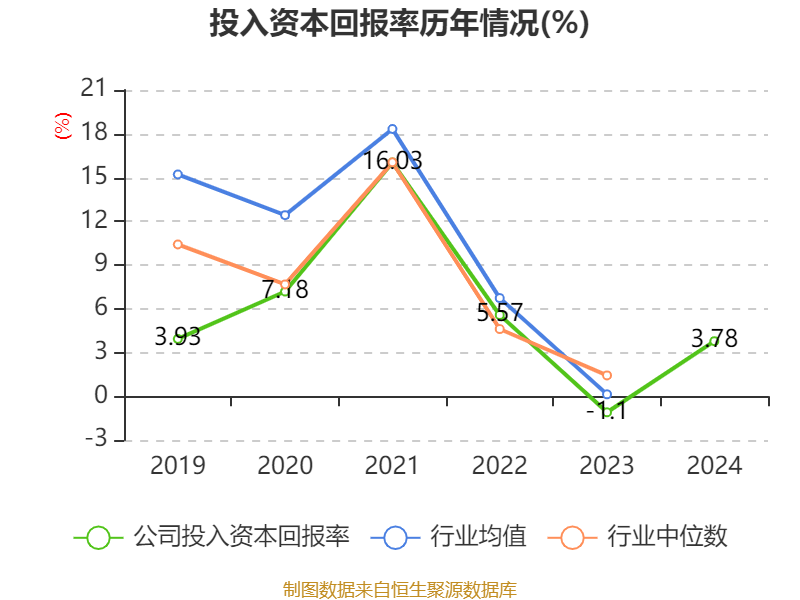 数据显示,2024年公司加权平均净资产收益率为5.63%,较上年同期上升4.85个百分点。公司2024年投入资本回报率为3.78%,较上年同期上升4.88个百分点。
