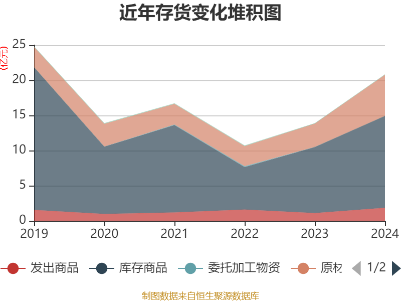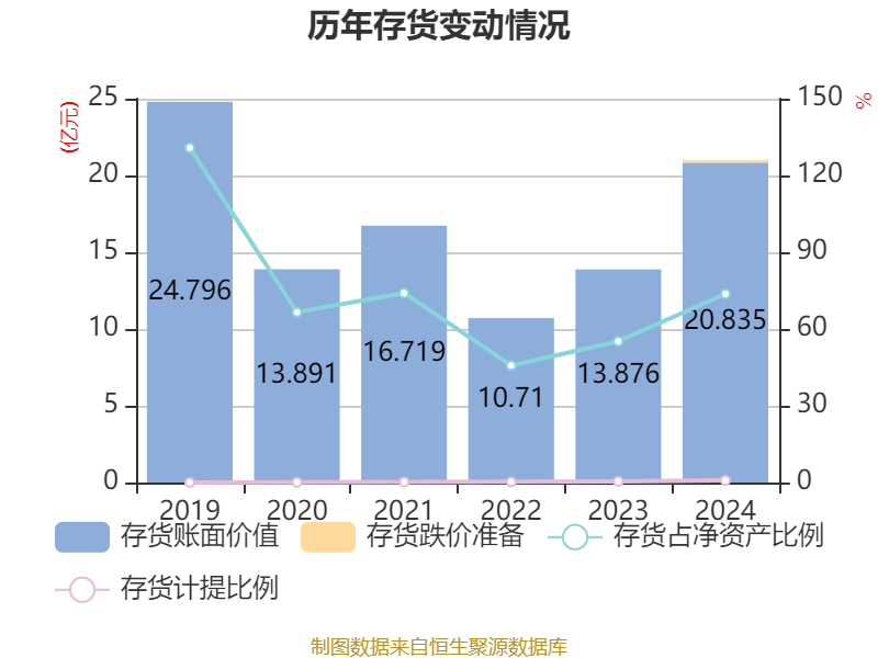 从存货变动来看,截至2024年末,公司存货账面价值为20.83亿元,占净资产的73.7%,较上年末增加6.96亿元。其中,存货跌价准备为1736.3万元,计提比例为0.83%。