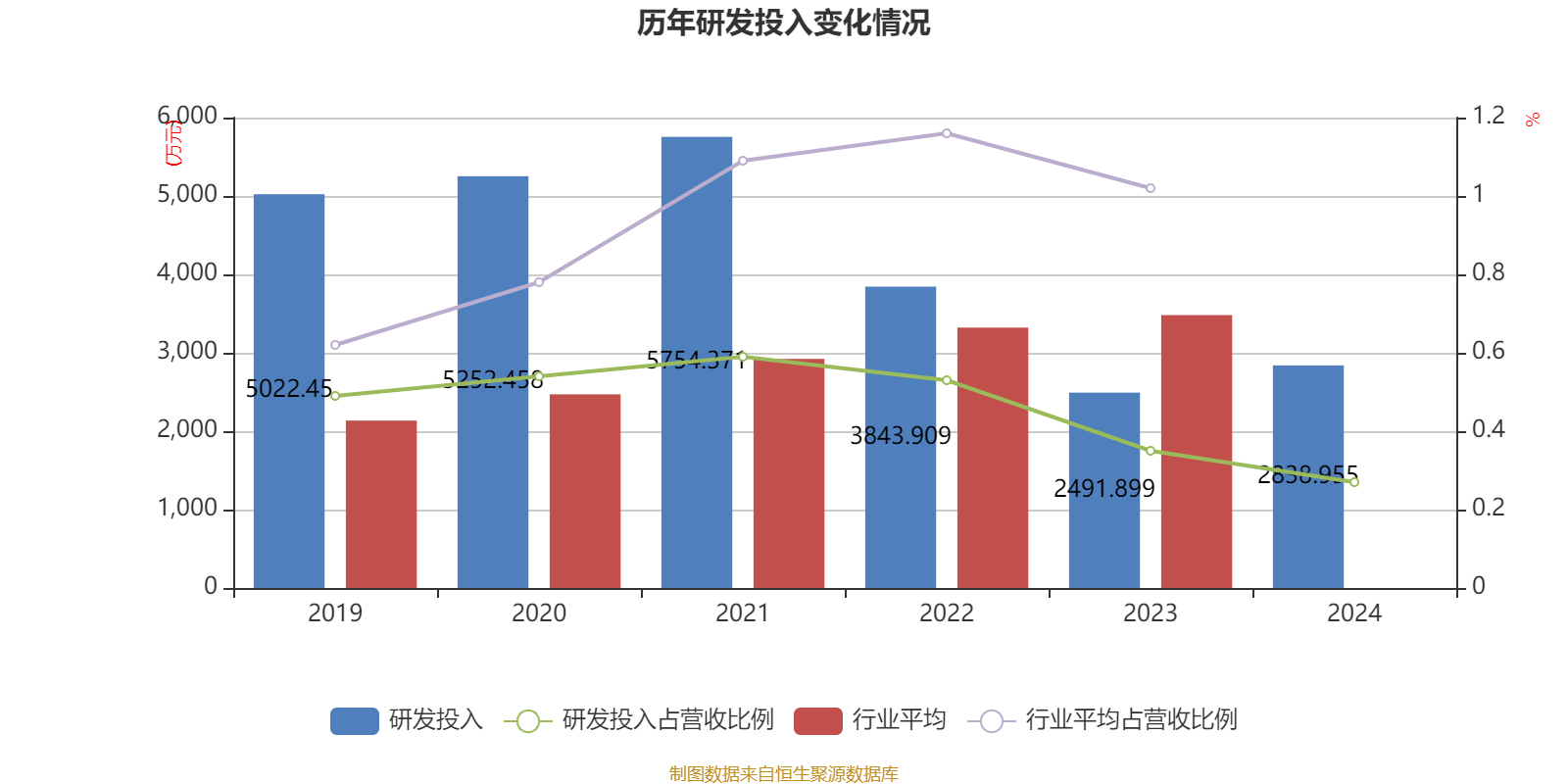 2024年全年,公司研发投入金额为2838.96万元,同比增长13.93%;研发投入占营业收入比例为0.27%,相比上年同期下降0.08个百分点。此外,公司全年研发投入资本化率为0%。