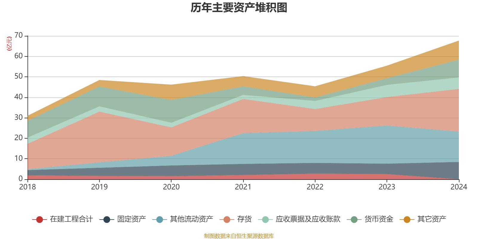 资产重大变化方面,截至2024年末,公司其他流动资产较上年末减少20.42%,占公司总资产比重下降11.7个百分点;货币资金较上年末增加164.34%,占公司总资产比重上升6.89个百分点;存货较上年末增加50.14%,占公司总资产比重上升5.76个百分点;在建工程合计较上年末减少100%,占公司总资产比重下降4.55个百分点。