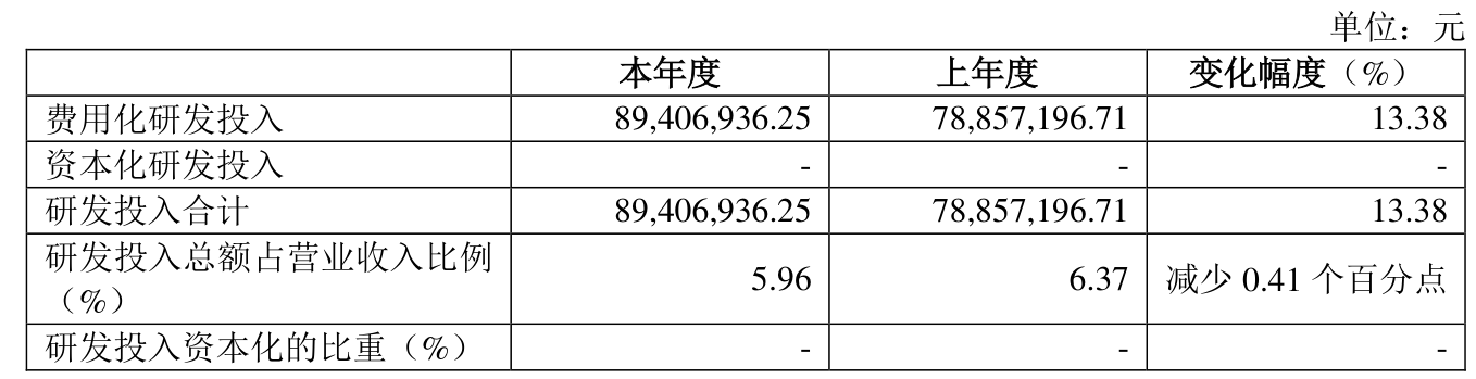 2024年全年,公司研发投入金额为8940.69万元,同比增长13.38%;研发投入占营业收入比例为5.96%,相比上年同期下降0.41个百分点。