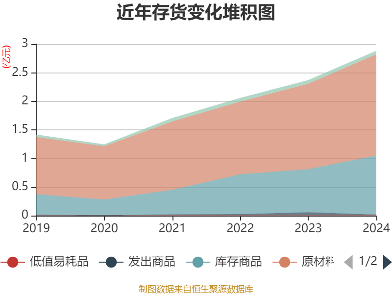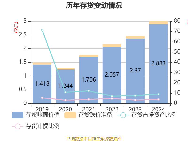 从存货变动来看,截至2024年末,公司存货账面价值为2.88亿元,占净资产的9.01%,较上年末增加5134.53万元。其中,存货跌价准备为1171.53万元,计提比例为3.9%。