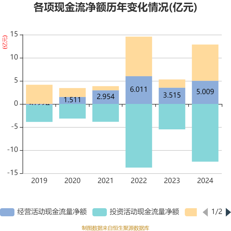 截至2024年,公司经营活动现金流净额为5.01亿元,同比增长42.51%;筹资活动现金流净额7.85亿元,同比增加6.06亿元;投资活动现金流净额-12.49亿元,上年同期为-5.5亿元。