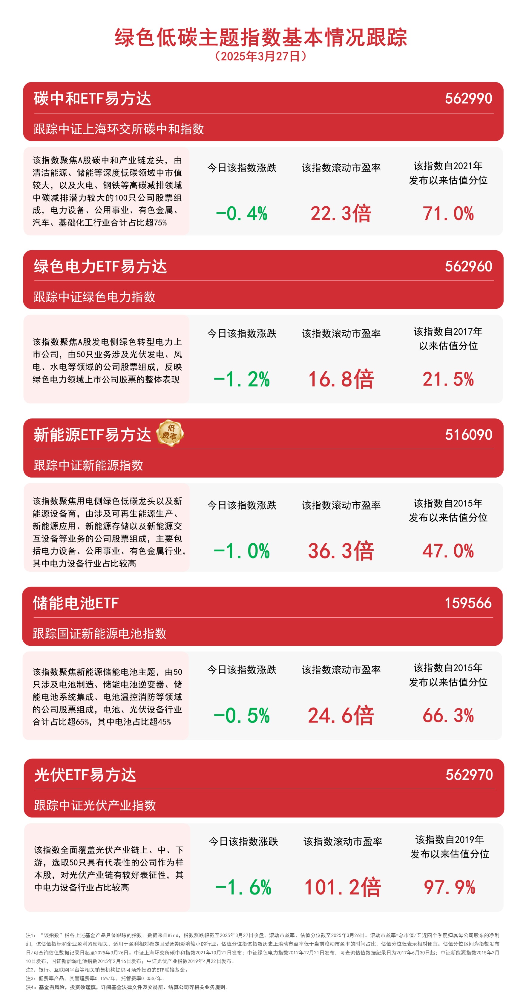 截至收盘,中证上海环交所碳中和指数下跌0.4%,国证新能源电池指数下跌0.5%,中证新能源指数下跌1.0%,中证绿色电力指数下跌1.2%,中证光伏产业指数下跌1.6%。