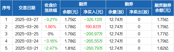 融资方面,当日融资买入1167.18万元,融资偿还1493.31万元,融资净偿还326.13万元。融券方面,融券卖出0股,融券偿还0股,融券余量12.74万股,融券余额38.47万元。融资融券余额合计1.75亿元。