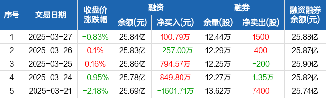 融资方面,当日融资买入4490.92万元,融资偿还4390.14万元,融资净买入100.79万元。融券方面,融券卖出3200股,融券偿还1700股,融券余量12.44万股,融券余额385.52万元。融资融券余额合计25.88亿元。
