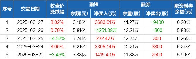 新开源融资融券信息显示,2025年3月27日融资净买入3683.01万元;融资余额6.18亿元,较前一日增加6.34%。