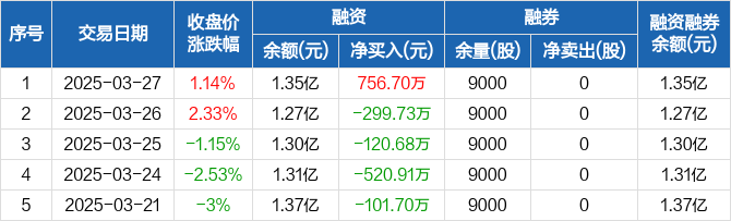 融资方面,当日融资买入1716.16万元,融资偿还959.46万元,融资净买入756.7万元。融券方面,融券卖出0股,融券偿还0股,融券余量9000股,融券余额3.2万元。融资融券余额合计1.35亿元。