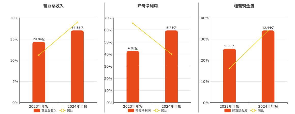 公司营业总收入为34.53亿元,较去年同报告期营业总收入增加5.49亿元,实现5年连续上涨,同比较去年同期上涨18.90%。归母净利润为6.75亿元,较去年同报告期归母净利润增加1.93亿元,实现4年连续上涨,同比较去年同期上涨39.97%。经营活动现金净流入为12.44亿元,较去年同报告期经营活动现金净流入增加3.15亿元,实现3年连续上涨,同比较去年同期上涨33.92%。
