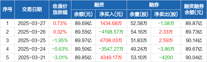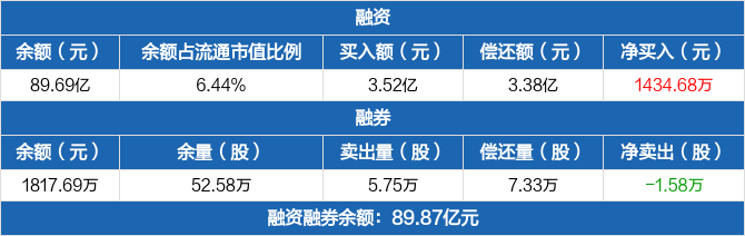 融资方面,当日融资买入3.52亿元,融资偿还3.38亿元,融资净买入1434.68万元。融券方面,融券卖出5.75万股,融券偿还7.33万股,融券余量52.58万股,融券余额1817.69万元。融资融券余额合计89.87亿元。