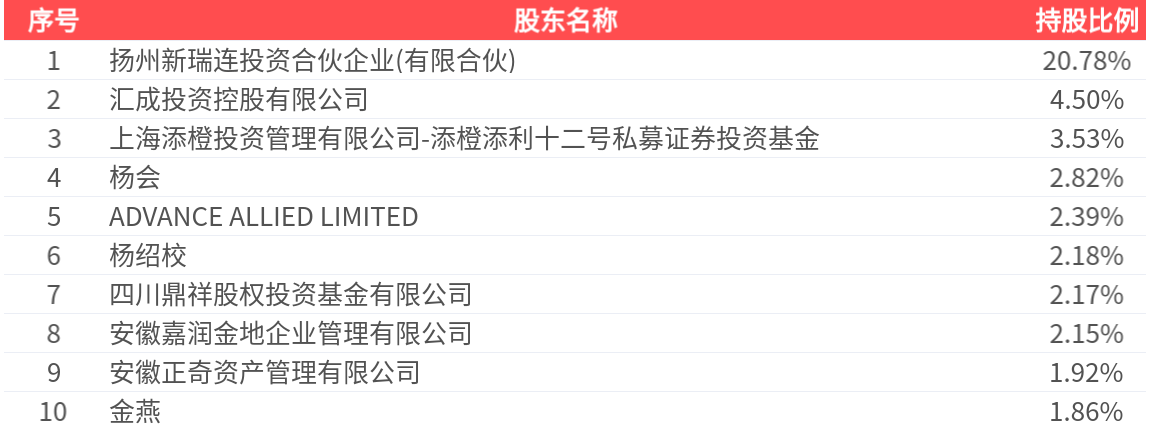 公司股东户数为2.08万户,前十大股东持股数量为3.71亿股,占总股本比例为44.30%,前十大股东持股情况如下: