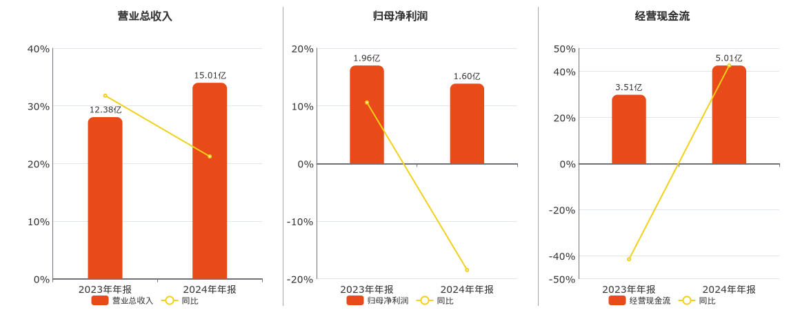 公司营业总收入为15.01亿元。归母净利润为1.60亿元,较去年同报告期归母净利润减少3622.08万元,同比较去年同期下降18.48%。经营活动现金净流入为5.01亿元。