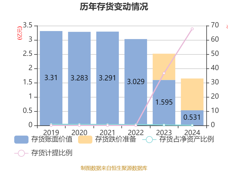 从存货变动来看,截至2024年末,公司存货账面价值为5306.55万元,占净资产的0.11%,较上年末减少1.06亿元。其中,存货跌价准备为1.11亿元,计提比例为67.75%。