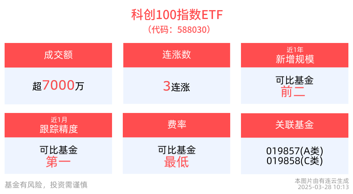 跟踪精度方面,截至2025年3月27日,科创100指数ETF近1月跟踪误差为0.012%,在可比基金中跟踪精度最高。