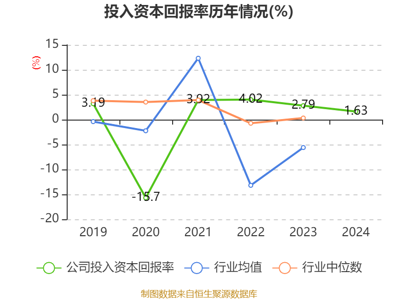 数据显示,2024年公司加权平均净资产收益率为2.06%,较上年同期下降1.08个百分点。公司2024年投入资本回报率为1.63%,较上年同期下降1.16个百分点。