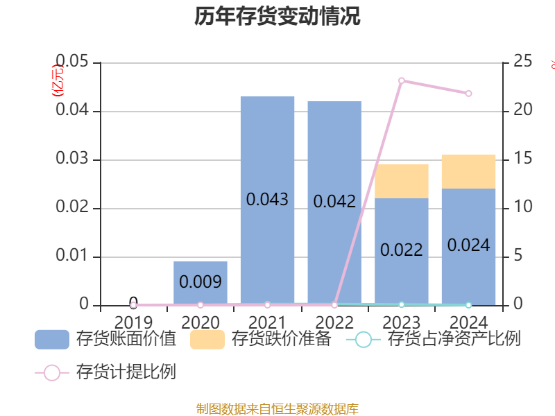从存货变动来看,截至2024年末,公司存货账面价值为240.44万元,较上年末增加17.58万元。其中,存货跌价准备为67.01万元,计提比例为21.8%。