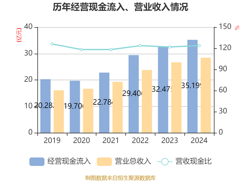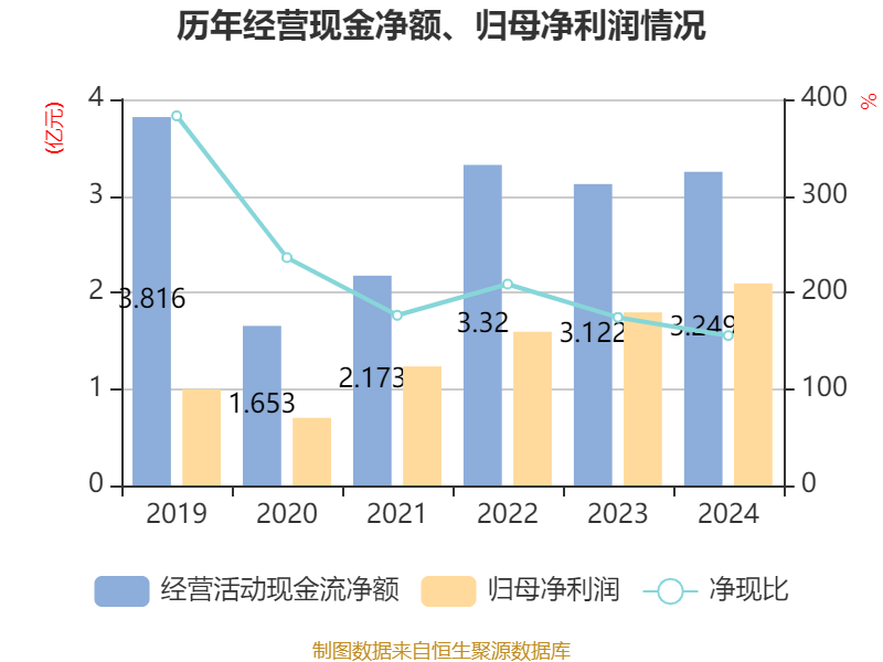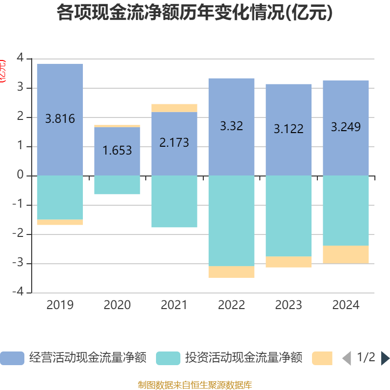 截至2024年,公司经营活动现金流净额为3.25亿元,同比增长4.07%;筹资活动现金流净额-6032.22万元,同比减少2305.01万元;投资活动现金流净额-2.4亿元,上年同期为-2.77亿元。