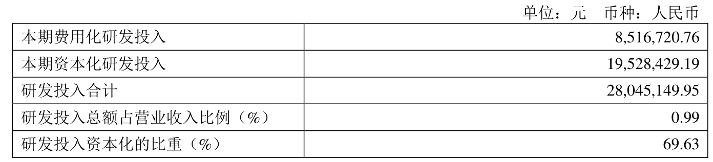 2024年全年,公司研发投入金额为2804.51万元,同比增长62.09%;研发投入占营业收入比例为0.99%,相比上年同期上升0.34个百分点。此外,公司全年研发投入资本化率为69.63%。