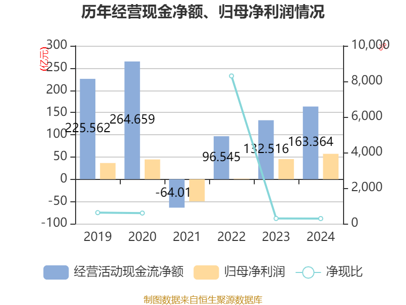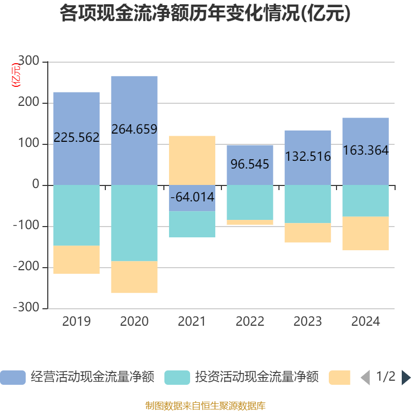 截至2024年,公司经营活动现金流净额为163.36亿元,同比增长23.28%;筹资活动现金流净额-81.75亿元,同比减少34.78亿元;投资活动现金流净额-77.11亿元,上年同期为-92.92亿元。