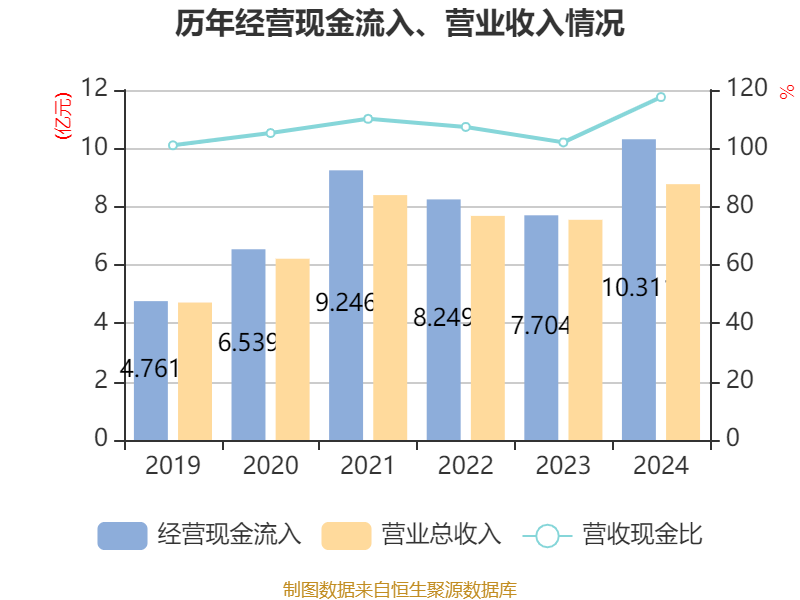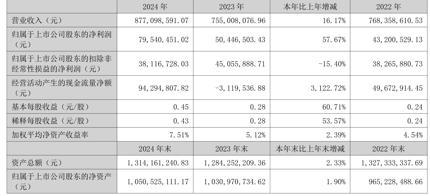 中证智能财讯神宇股份(300563)3月28日披露2024年年度报告。2024年,公司实现营业总收入8.77亿元,同比增长16.17%;归母净利润7954.05万元,同比增长57.67%;扣非净利润3811.67万元,同比下降15.40%;经营活动产生的现金流量净额为9429.48万元,上年同期为-311.95万元;报告期内,神宇股份基本每股收益为0.45元,加权平均净资产收益率为7.51%。公司2024年度分配预案为:拟向全体股东每10股派现2元(含税)。
