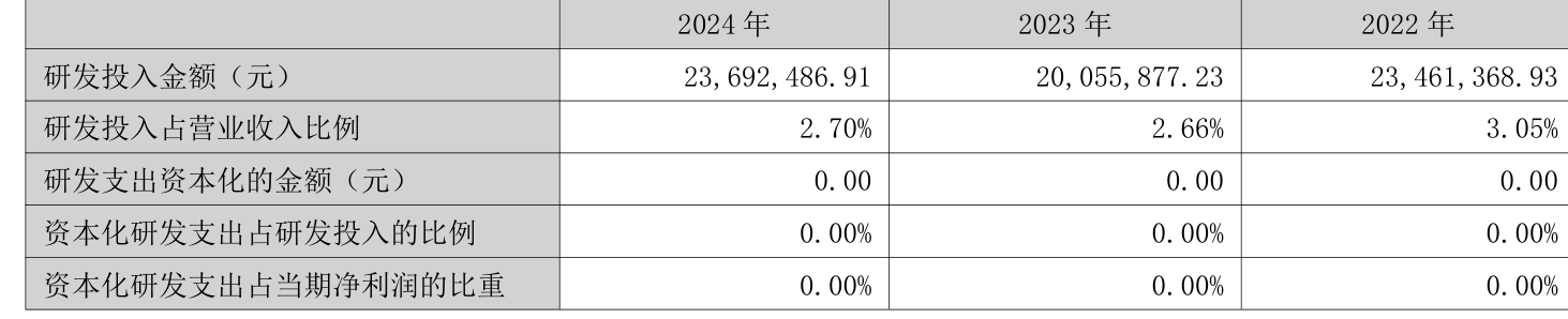 2024年全年,公司研发投入金额为2369.25万元,同比增长18.13%;研发投入占营业收入比例为2.7%,相比上年同期上升0.04个百分点。公司全年研发投入资本化率为0。