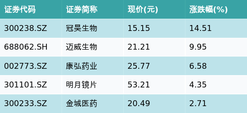 截至早盘收盘,眼科医疗主题涨跌幅最高的五只股票为:冠昊生物(300238.SZ)、迈威生物(688062.SH)、康弘药业(002773.SZ)、明月镜片(301101.SZ)与金城医药(300233.SZ)。详情见下表: