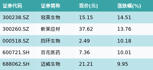 截至早盘收盘,生物医药主题涨跌幅最高的五只股票为:冠昊生物(300238.SZ)、新莱应材(300260.SZ)、四环生物(000518.SZ)、百花医药(600721.SH)与迈威生物(688062.SH)。详情见下表:
