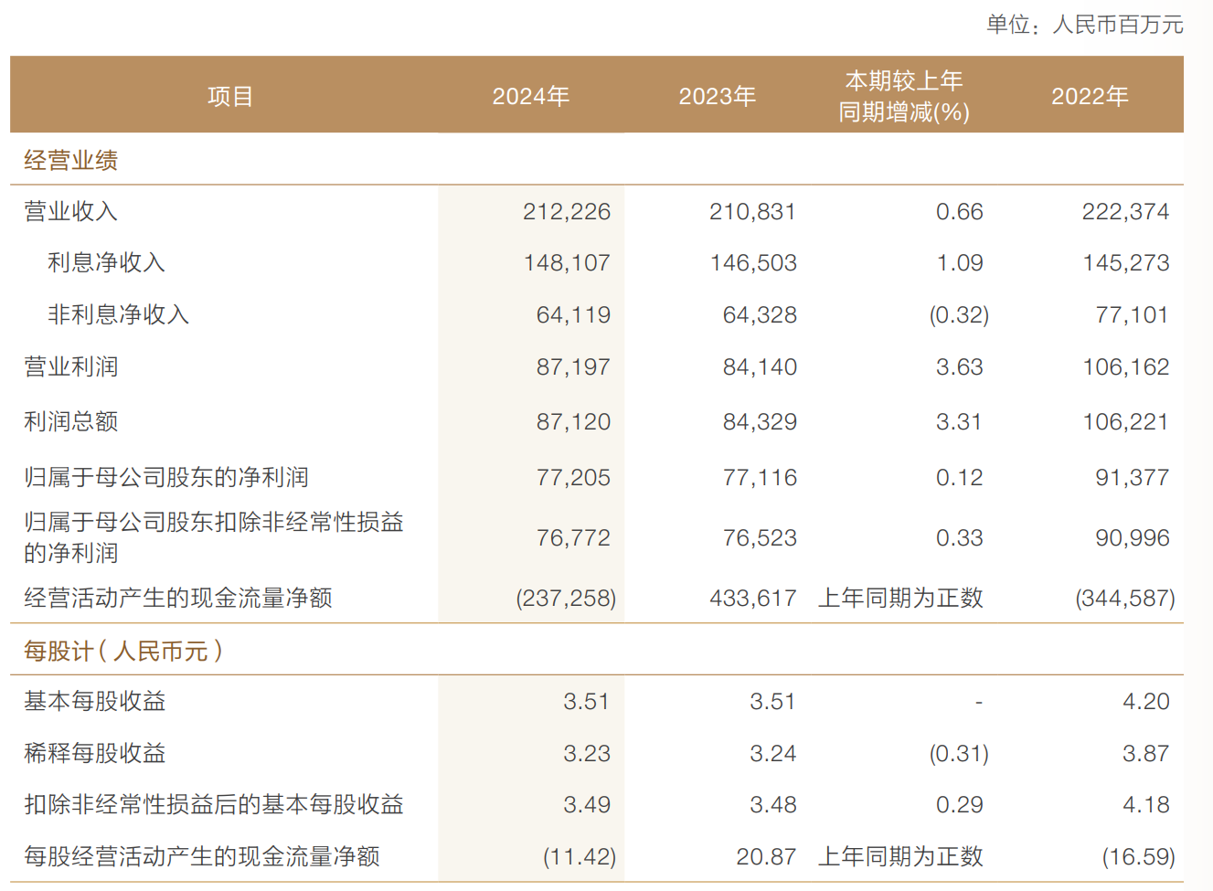 中证智能财讯兴业银行(601166)3月28日披露2024年年度报告。2024年,公司实现营业总收入2122.26亿元,同比增长0.66%;归母净利润772.05亿元,同比增长0.12%;扣非净利润767.72亿元,同比增长0.33%;经营活动产生的现金流量净额为-2372.58亿元,上年同期为4336.17亿元;报告期内,兴业银行基本每股收益为3.51元,加权平均净资产收益率为9.89%。公司2024年度分配预案为:拟向全体股东每10股派现10.6元(含税)。
