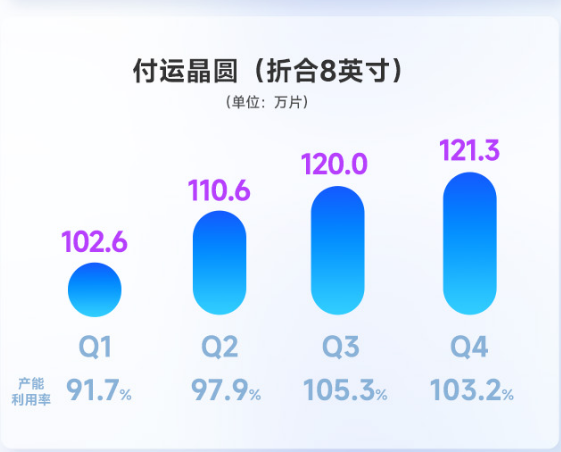 财报显示,得益于产业复苏和无锡项目投产,2024年,华虹公司产能、营收均逐季增加,全年产能利用率达到99.5%,同比提升5.2个百分点;付运晶圆(折合8英寸)454.5万片,同比提升10.8%,其中第一至第四季度付运晶圆分别为102.6万片、110.6万片、120万片、121.3万片。