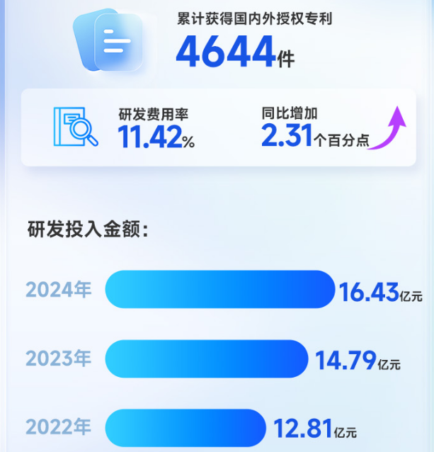 截至2024年底,华虹公司累计获得国内外授权专利达到4644件。这背后,是华虹公司连续增长的研发投入和澎湃创新动能。公司披露,其2022年、2023年、2024年研发投入金额分别为12.81亿元、14.79亿元、16.43亿元。其中2024年研发费用率达到11.42%,同比增加2.31个百分点。