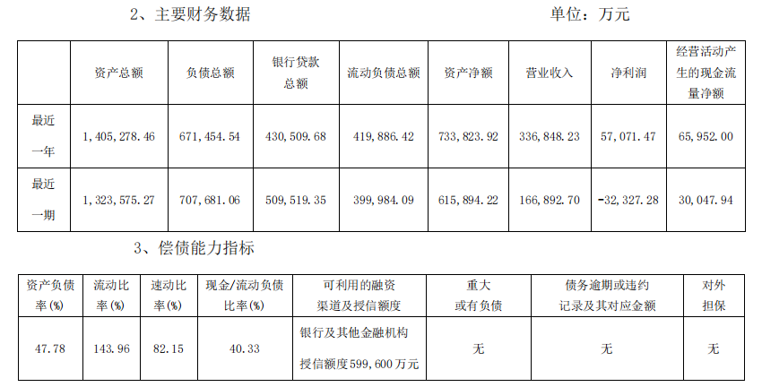 东宝集团的财务数据显示,公司最近一期营收16.69亿元,净利润亏损3.23亿元;资产负债率为47.78%、流动比率143.96%、速动比率82.15%,但持有599.6亿元银行授信额度且无债务逾期记录。