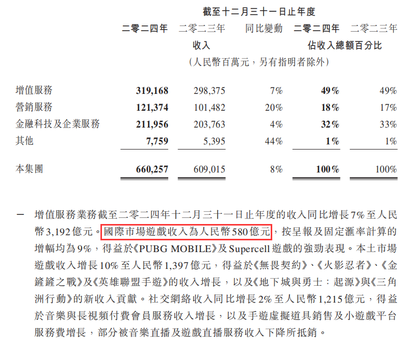 2024年年报中,腾讯全年营收6602.57亿元,同比增长8%;归母净利润1940.73亿元,同比增长68%。其中,得益于《PUBG MOBILE》和Supercell游戏的强劲表现,其国际市场游戏收入580亿元,同比增长9%;国内游戏收入1397亿元,同比增长10%。