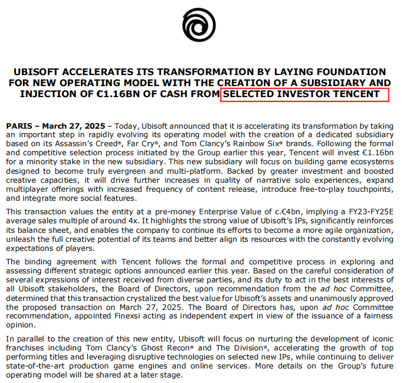 2024年10月,有市场传言称,腾讯与育碧创始家族Guillemot讨论私有化,育碧股价一度暴涨33%。2025年1月,双方谈判转向成立新公司,整合育碧部分资产及团队。