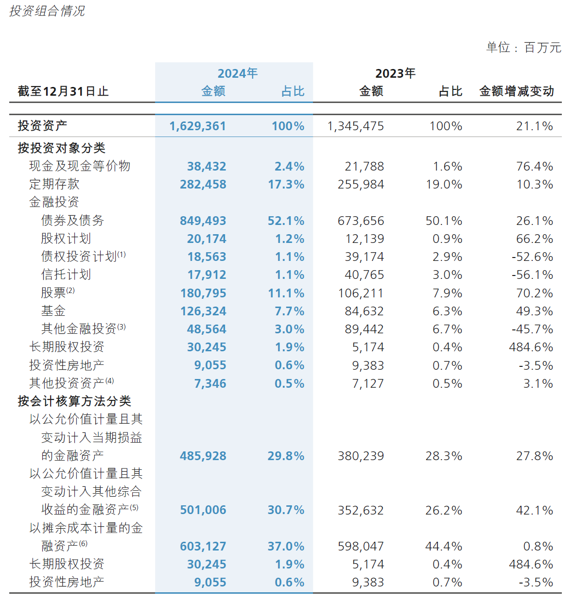 真正大幅增长的是总投资收益和综合投资收益。2024年公司实现总投资收益796.87亿元,同比大增251.6%;实现综合投资收益1149.61亿元,同比大增252.5%。总投资收益=净投资收益+投资资产买卖价差损益+公允价值变动损益+投资资产减值损失+联营和合营企业权益法确认损益。对险企来说,综合投资收益=总投资收益+计入其他综合收益的其他债权投资与其他权益工具投资当年公允价值变动净额。可以看到,这里面的增长主要来自公允价值的变动,2024年公司资产公允价值变动损益为357.18亿元,比2023年增加了416.53亿元。