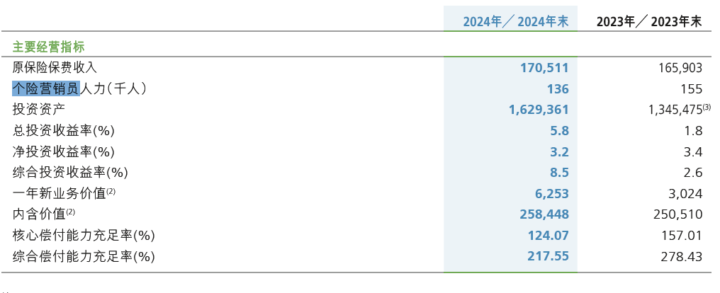 从负债端来看,一方面,行业周期开始有所恢复,另一方面2023年较低的基数,共同推动新华保险新业务价值的高增长。公司2024年新业务价值62.53亿元,同比增长106.8% ;首年保费口径下新业务价值率14.6%,较2023年的6.7%提高7.9个百分点。