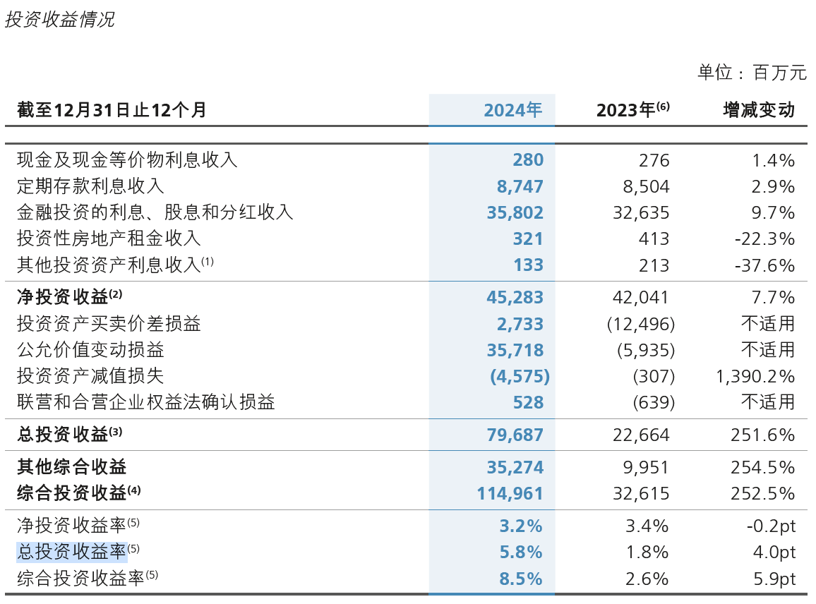 从投资收益的具体构成看,2024年公司实现净投资收益452.83亿元,同比增长7.7%,也就是说净投资收益并不是投资收益大幅增长的主要来源。净投资收益包括现金及现金等价物、定期存款和金融投资等的利息、股息和分红收入及投资性房地产租金收入。