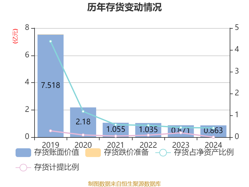 从存货变动来看,截至2024年末,公司存货账面价值为8634.5万元,占净资产的0.42%,较上年末减少76.14万元。公司本期没有计提存货跌价准备。