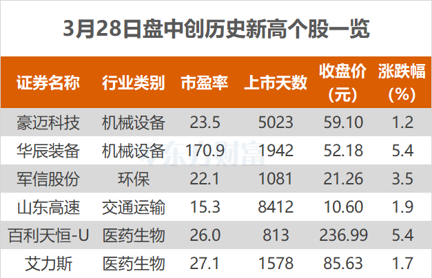 3月28日,A股三大指数今日集体回调,截止收盘,沪指跌0.67%,收报3351.31点;深证成指跌0.57%,收报10607.33点;创业板指跌0.79%,收报2128.21点。东方财富Choice数据显示,今日有6只个股盘中股价创历史新高,分别为华辰装备、军信股份等。
