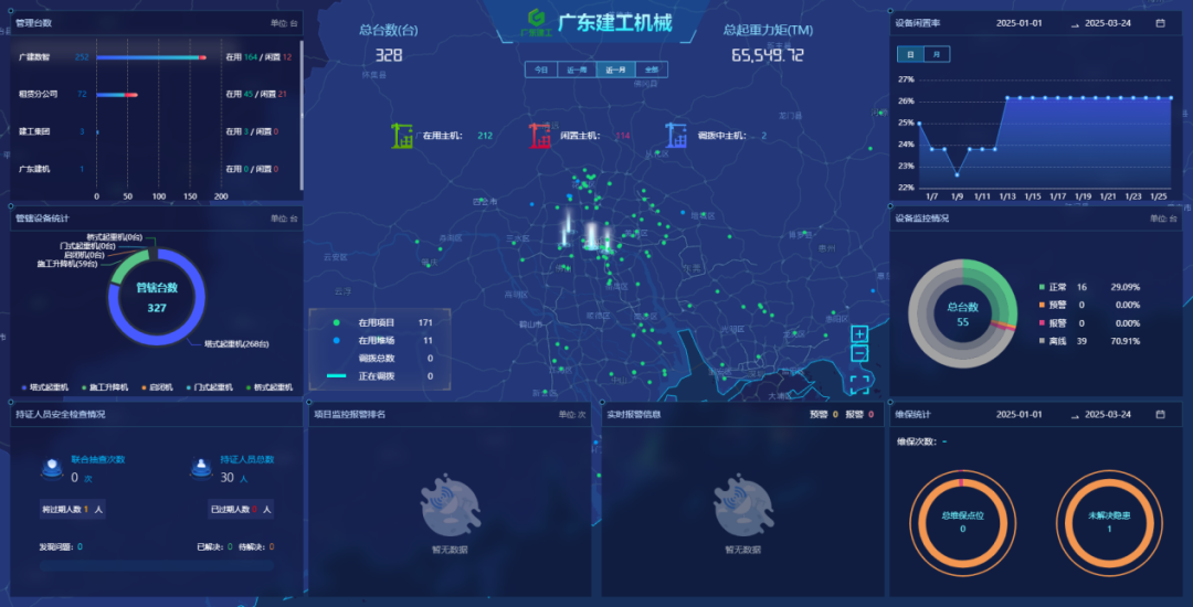 自获得广东省专项资金以来,基于广东建工控股在建筑机械领域深耕数十年的专业经验,广东建机安管平台以广东省广建数智科技有限公司为载体进行实体建设,深度融合5G、大数据、物联网、云计算等前沿科技,成功搭建起以“设备安全监控”“无人机智能巡检系统”“远程控制系统”“智能安全帽巡检系统”“塔机顶升安全监控”等八大监管体系为框架、以“全生命周期-全流程-全要素”为优势、以推动行业构建从“要我安全”向“我要安全”转型为目标的智能安全防护网。