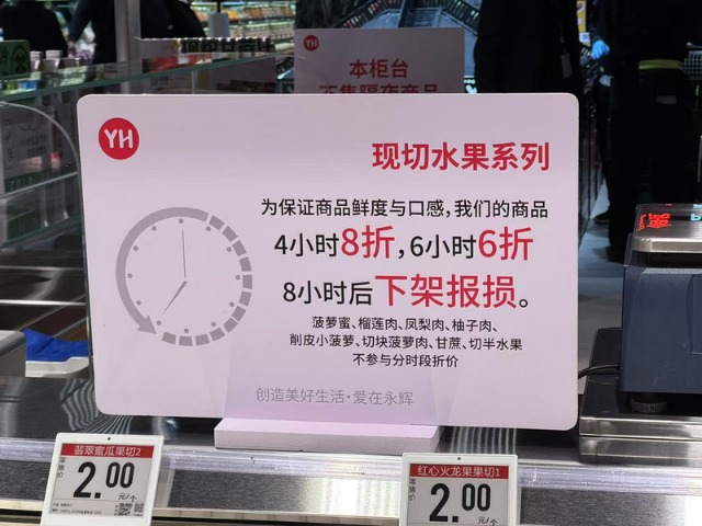 与盒马相似,调改后的永辉入口处,设置了果切区。但与其不同的是,永辉创新性地引入了“468小时折扣”机制——即水果现切后4小时内打八折,6小时内打六折,8小时后则下架报损。