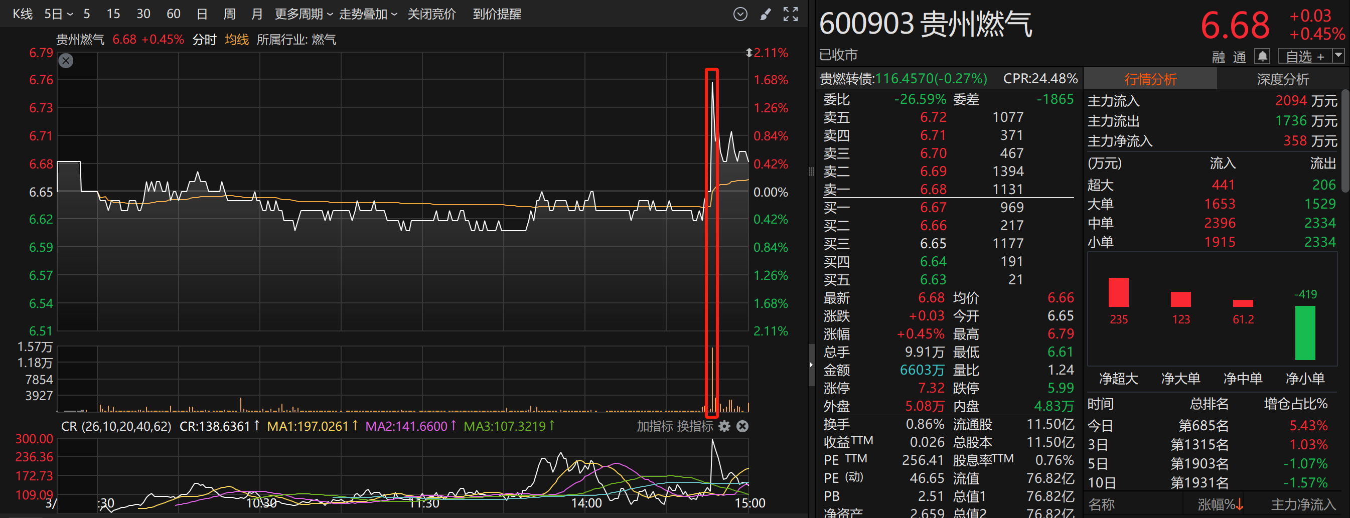 不过,就在今日尾盘,14时46分、47分时,贵州燃气股票交易出现异动,突现“150万股大单”。通过Level-2拆单后,可以看到由多笔千手级别以及数百手级别的大单构成。对此,有投资者质疑称:“尾盘有人知道内幕进去了”。