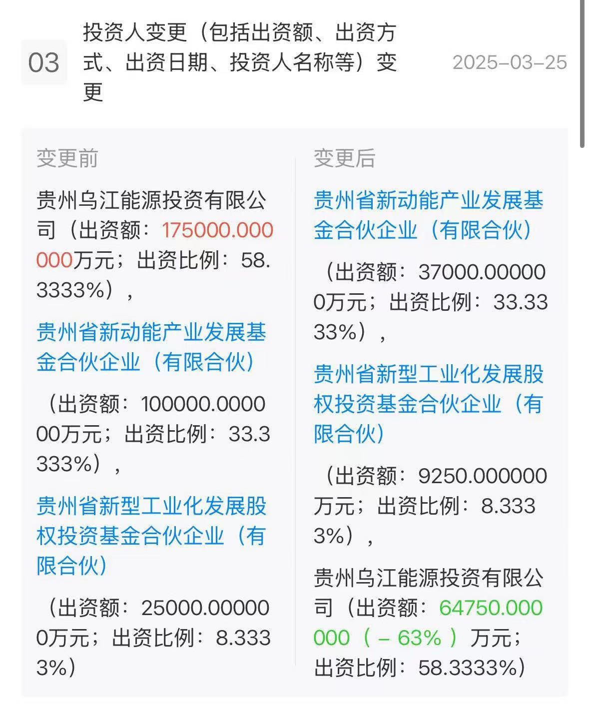 值得注意的是,天眼查信息显示,今年3月25日,乌江能投、新动能基金和工业化基金同时减少对贵州页岩气的出资额,合计减少18.9亿元。同日,一家名为“贵州乌江页岩气勘探有限公司”的企业成立,注册资本恰为18.9亿元,乌江能投、新动能基金和工业化基金分别持股58.33%、33.33%和8.33%,而贵州页岩气也由上述股东按相同比例持股。有投资者形容,此举为“接受一家转让的门店,然后原店主又在隔壁开了一家一模一样的门店”。