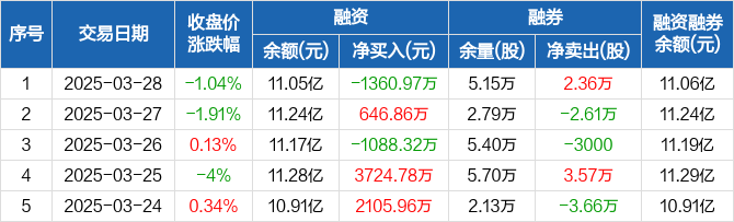 融资方面,当日融资买入2895.58万元,融资偿还4256.55万元,融资净偿还1360.97万元。融券方面,融券卖出2.82万股,融券偿还4600股,融券余量5.15万股,融券余额112.84万元。融资融券余额合计11.06亿元。