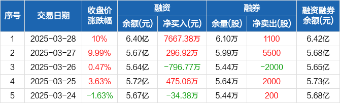 融资方面,当日融资买入3.73亿元,融资偿还2.97亿元,融资净买入7667.38万元,净买入额创历史新高,净买入额两市排名第13。融券方面,融券卖出1100股,融券偿还0股,融券余量6.1万股,融券余额190.56万元。融资融券余额合计6.42亿元。