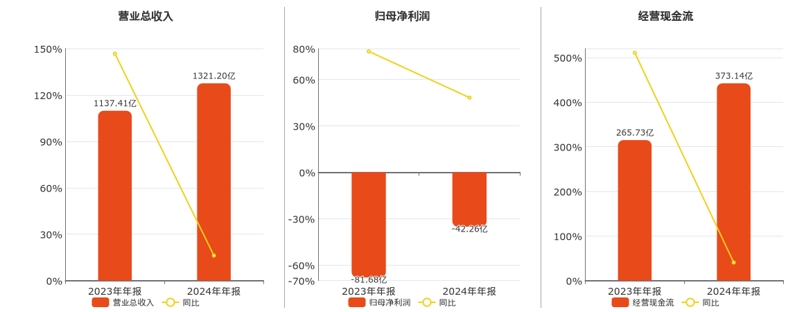 公司营业总收入为1321.20亿元,较去年同报告期营业总收入增加183.32亿元,实现2年连续上涨,同比较去年同期上涨16.11%。归母净利润为-42.26亿元,较去年同报告期归母净利润增加39.64亿元,实现2年连续上涨。经营活动现金净流入为373.14亿元,较去年同报告期经营活动现金净流入增加107.61亿元,实现2年连续上涨,同比较去年同期上涨40.53%。