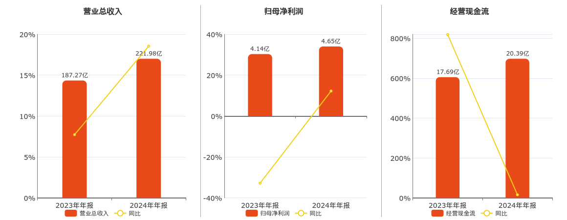 公司营业总收入为221.98亿元,较去年同报告期营业总收入增加34.71亿元,实现5年连续上涨,同比较去年同期上涨18.54%。归母净利润为4.65亿元,较去年同报告期归母净利润增加5068.24万元,同比较去年同期上涨12.24%。经营活动现金净流入为20.39亿元,较去年同报告期经营活动现金净流入增加2.70亿元,实现2年连续上涨,同比较去年同期上涨15.24%。