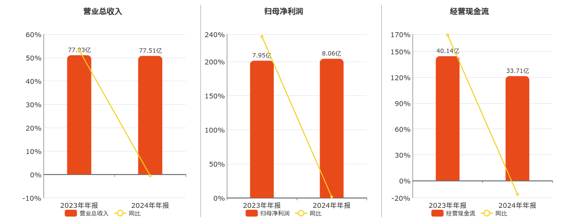 公司营业总收入为77.51亿元。归母净利润为8.06亿元,较去年同报告期归母净利润增加1124.05万元,实现2年连续上涨,同比较去年同期上涨1.41%。经营活动现金净流入为33.71亿元。