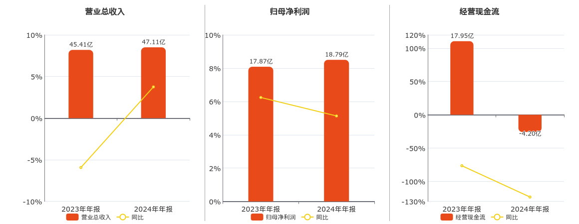 公司营业总收入为47.11亿元,较去年同报告期营业总收入增加1.70亿元,同比较去年同期上涨3.75%。归母净利润为18.79亿元,较去年同报告期归母净利润增加9164.41万元,实现5年连续上涨,同比较去年同期上涨5.13%。经营活动现金净流入为-4.20亿元。
