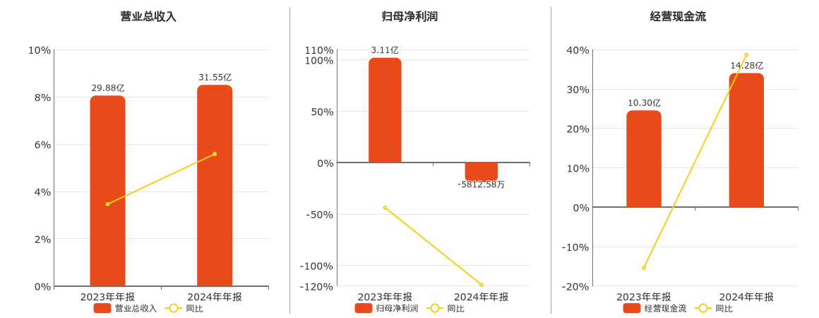 公司营业总收入为31.55亿元,较去年同报告期营业总收入增加1.67亿元,实现5年连续上涨,同比较去年同期上涨5.58%。归母净利润为-5812.58万元,较去年同报告期归母净利润减少3.69亿元,同比较去年同期下降118.71%。经营活动现金净流入为14.28亿元,较去年同报告期经营活动现金净流入增加3.98亿元,同比较去年同期上涨38.62%。