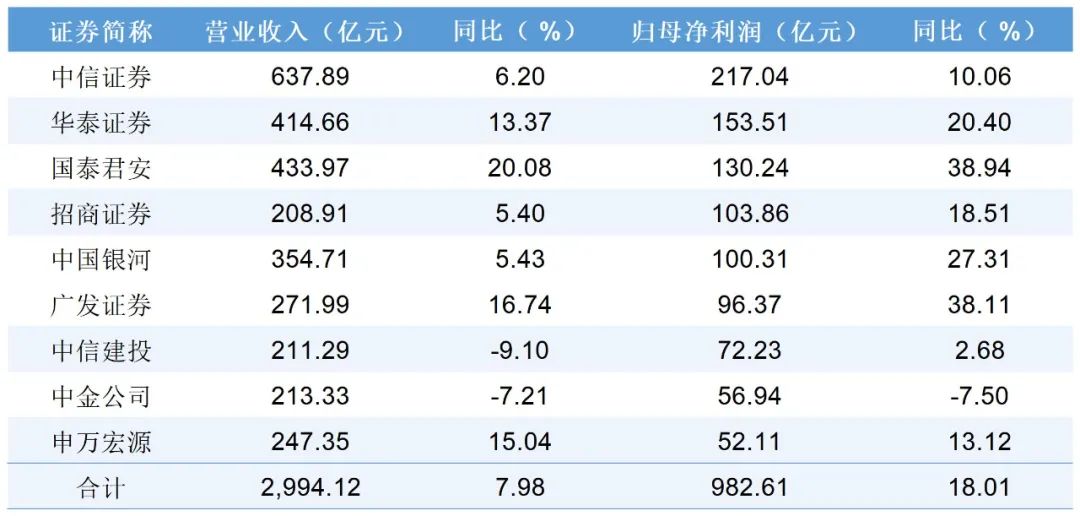 截至《证券日报》记者发稿,中信证券、华泰证券、国泰君安、中信建投、中国银河、中金公司、申万宏源、招商证券、广发证券九大头部券商的2024年年度经营业绩全部出炉,成为市场关注的焦点。其中,7家头部券商实现营业收入、净利润同比双增长,中信证券、华泰证券2024年归母净利润均超150亿元。九大头部券商2024年合计实现营业收入2994.12亿元,同比增长7.98%;合计实现归母净利润982.61亿元,同比增长18.01%。